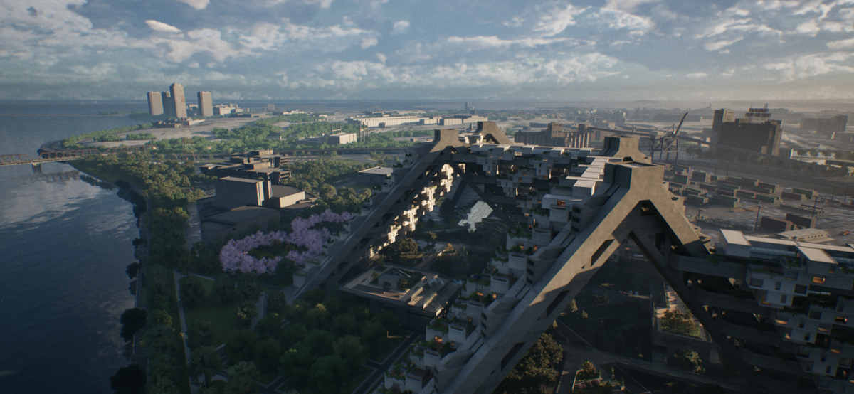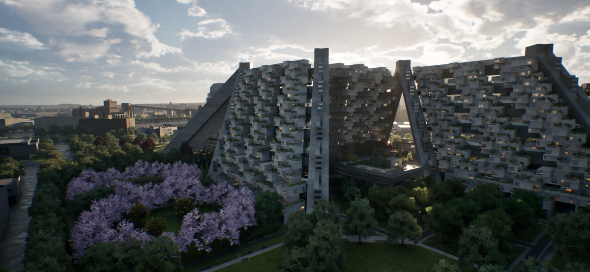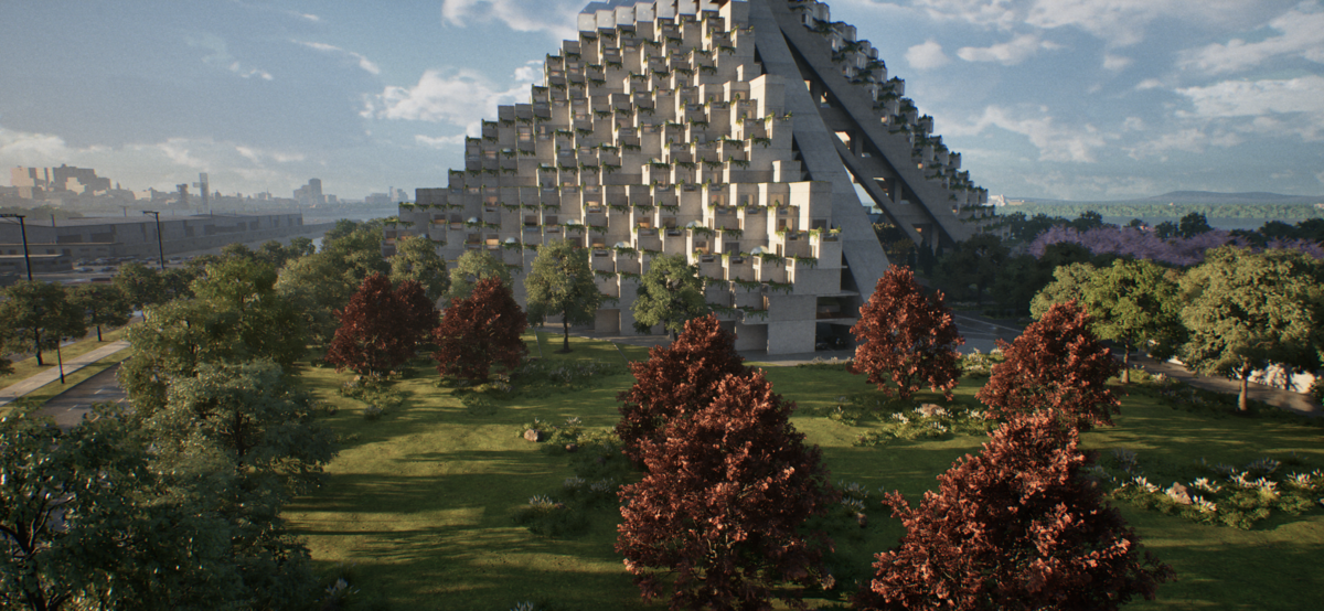 ”Habitat 67”オリジナルのビジョンをUE5で再現した建築で、実際に50年も前に建てられた当初の半分以下の規模に縮小して建てたカナダの集合住宅。